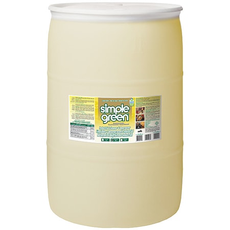 Cleaner/Degreaser, Drum, 55 gal, Ready to Use/Concentrated Concentrated, Recommended Dilution 1:10 to 1:30, Cleaner Form Liquid, VOC Content 0 Percent, Nonflammable Yes, Biodegradable Yes, Butyl Free Yes, Plastic Safe Yes, Application Equipment/Machinery, Facility Maintenance, Fleet/Vehicle, Parts Washing, pH Value Alkaline, pH Level 9.5, EPA Safer Choice, OSHA, Primary Chemical Water, Base Formula Water Based, Cleaner VOC Range No VOC, NSF Rating Not Rated, Product Series Simple Green