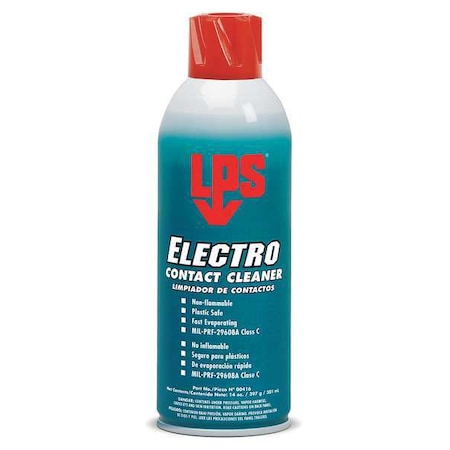Contact Cleaner, Plastic Safe Yes, Plastic Compatibility Safe on All Plastics, Container Type Aerosol Spray Can, Container Size 14 oz, Cleaner Form Liquid, Dielectric Strength 22 kV, VOC Content 45 Percent, NSF Rating Not Rated, Product Series Electro, Nonflammable Yes, Product Label Contact Cleaner, Chlorinated Yes, Standards CARB, LADCO, OTC, Base Formula Chemical Based Solvent, Biodegradable No, Butyl Free No, Flash Point 0 Degrees F, Net Weight 14 oz