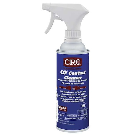 Contact Cleaner, Plastic Safe Yes, Plastic Compatibility Safe on All Plastics, Container Type Trigger Spray Can, Container Size 10 oz, Cleaner Form Liquid, Dielectric Strength 27.6 kV, VOC Content 0 Percent, NSF Rating K2, Product Series CO(R), Nonflammable Yes, Product Label Contact Cleaner, Chlorinated No, Standards NSF Rated, RoHS Compliant, Base Formula Chemical Based Solvent, Biodegradable No, Butyl Free No, Flash Point 0 Degrees F, Net Weight 10 oz, Primary Chemical HFC
