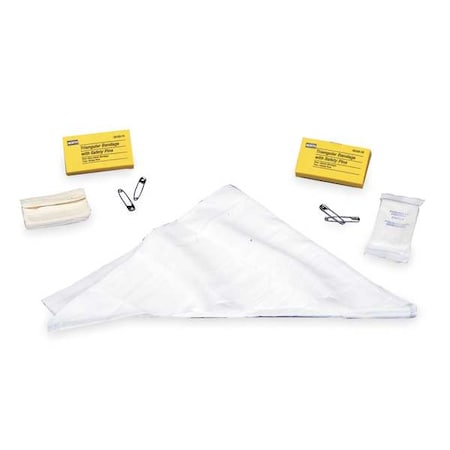 Triangular Bandage, Bandage Length - Short Side 42 in, Bandage Length - Long Side 56 in, Number of Pins Included 2, Sterility Non-Sterile, Unitized Unitized, Water Resistance Water Resistant, Latex Content Latex Free, Compatible Manufacturer Part Number Not Applicable, Bandage Color White, Bandage Material Fabric, Package Type Unitized, Standards ANSI/ISEA Z308.1-2009