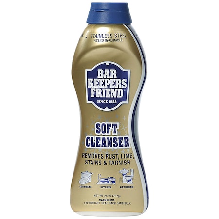 Soft Cleanser, All Purpose Cleaner, Surfaces for Use On Aluminum, Brass, Bronze, Ceramic, Copper Alloys, Corian, Glass, Porcelain, Stainless Steel, Bottle, 26 oz, Fragrance Citrus, Ready to Use/Concentrated Ready to Use, Recommended Dilution Ready to Use, Primary Chemical Citric Acid, Oxalic Acid, Liquid, Standards Not Applicable, Butyl Free Yes, VOC Content 0 Percent, NSF Rating Not Rated, Product Series Bar Keepers Friend, Rinse Required Yes, Nonflammable Yes, Net Weight 26 oz